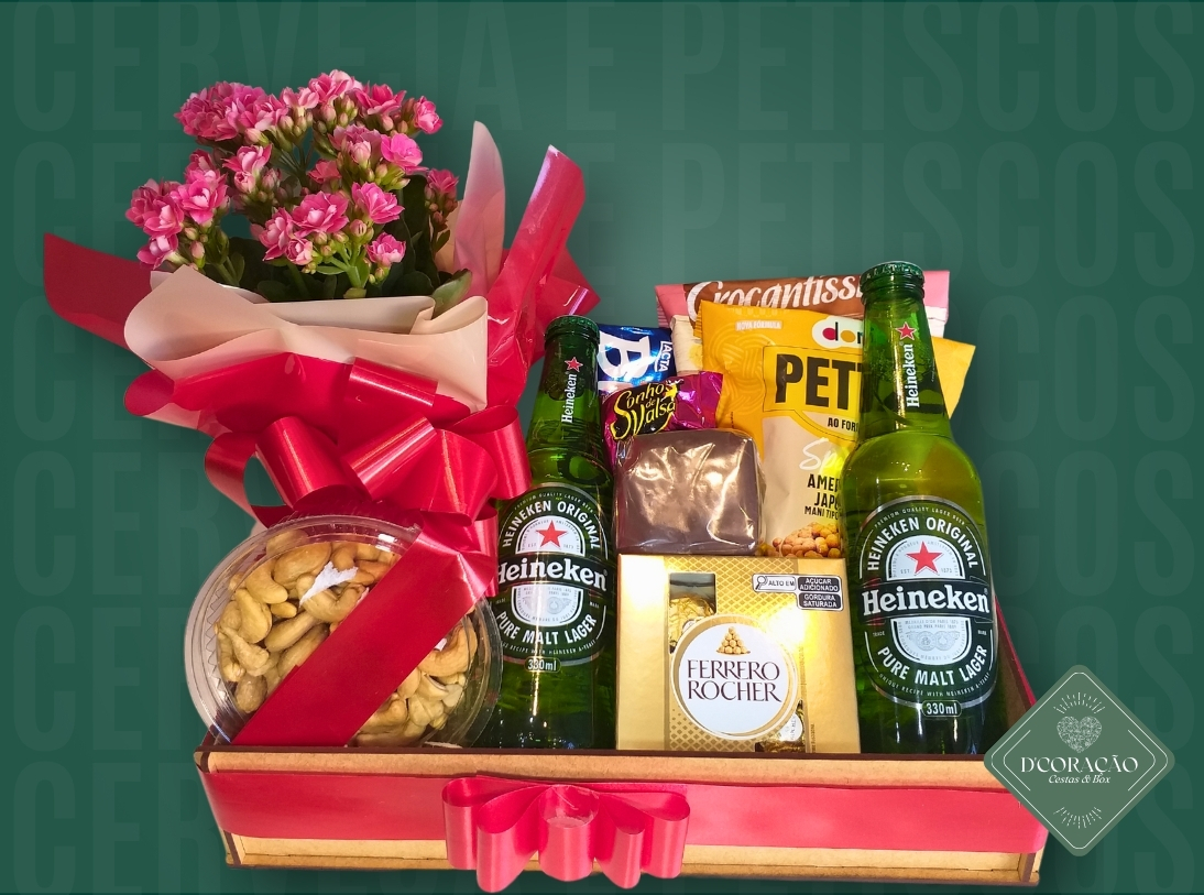 Uma composição especial que une cervejas, chocolates, petiscos e o charme de uma flor.
